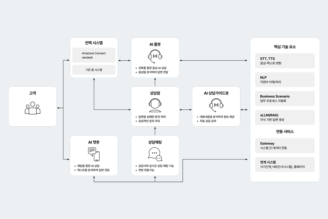 Amazon Connectの安定性を基盤にZendesk/Salesforce CRM統合、GenAI・Rulebot基盤自動化、AIR Connect Portalのような運営ツールまで結合して企業規模とニーズに応じて拡張可能なオールインワンカスタマーセンター環境を構築します。