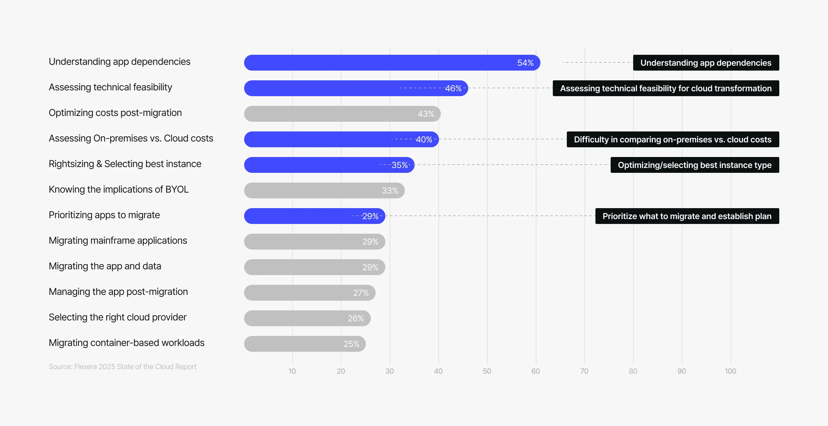 多くの企業がアプリケーション関連関係把握(54%)と技術的転換妥当性検討(46%)段階で大きな難関を経験します。 既存の手作業中心方式はデータ整合性を落とし、プロジェクト不確実性を高める主要原因になります。
